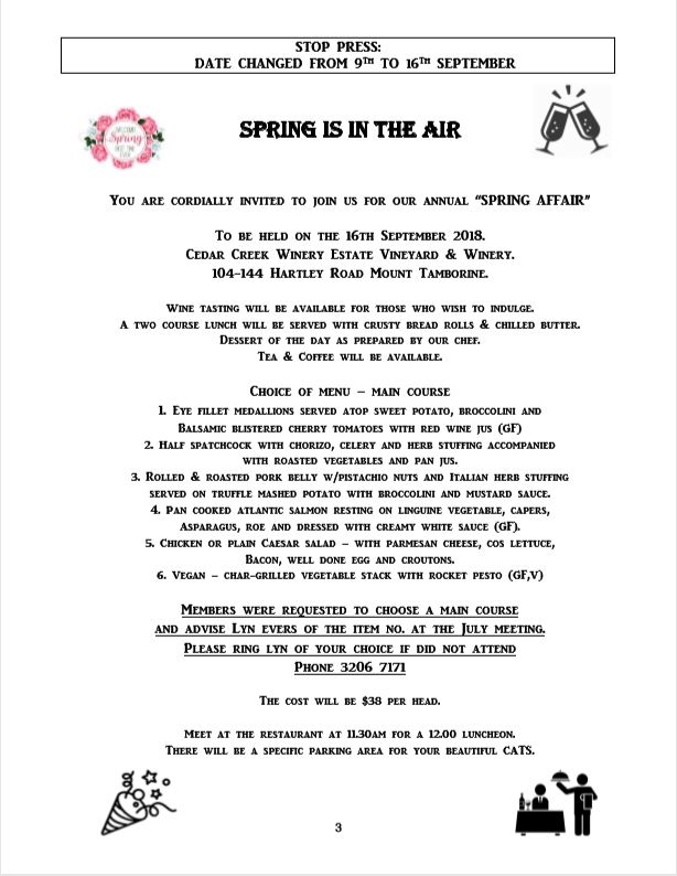 The Spring Affair this year will be a lunch at the Cedar Creek Winery Estate Mount Tamborine.