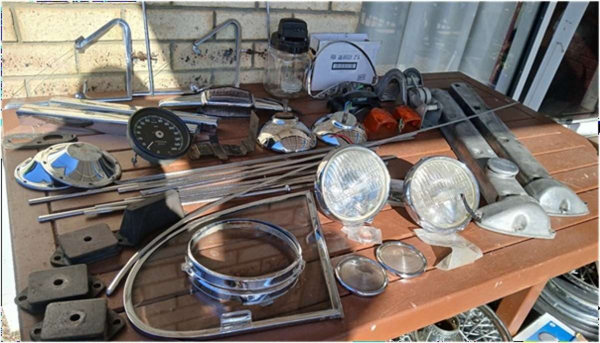 For Sale a selection of used trim and other parts for a Mk2 in fair to good condition. Included are a pair of fog lights and chrome surrounds, door chrome strips, chrome bars (between the doors), one rear mudguard chrome strip, tail light frames (unchromed), number plate & backup light,number plate chrome surround, front quarter windows, one rear quarter window, speedometer, horn ring for steering wheel, 2 top bakelite steering column covers, rear interior light lenses, window washer bottle, one front mudguard chrome spear, four hubcaps in good condition, a boot hinge, steering box,engine cam covers, door handles, front suspension rubbers and brake parts.I also have four chrome curly hub spoked wheels in fair to good condition.